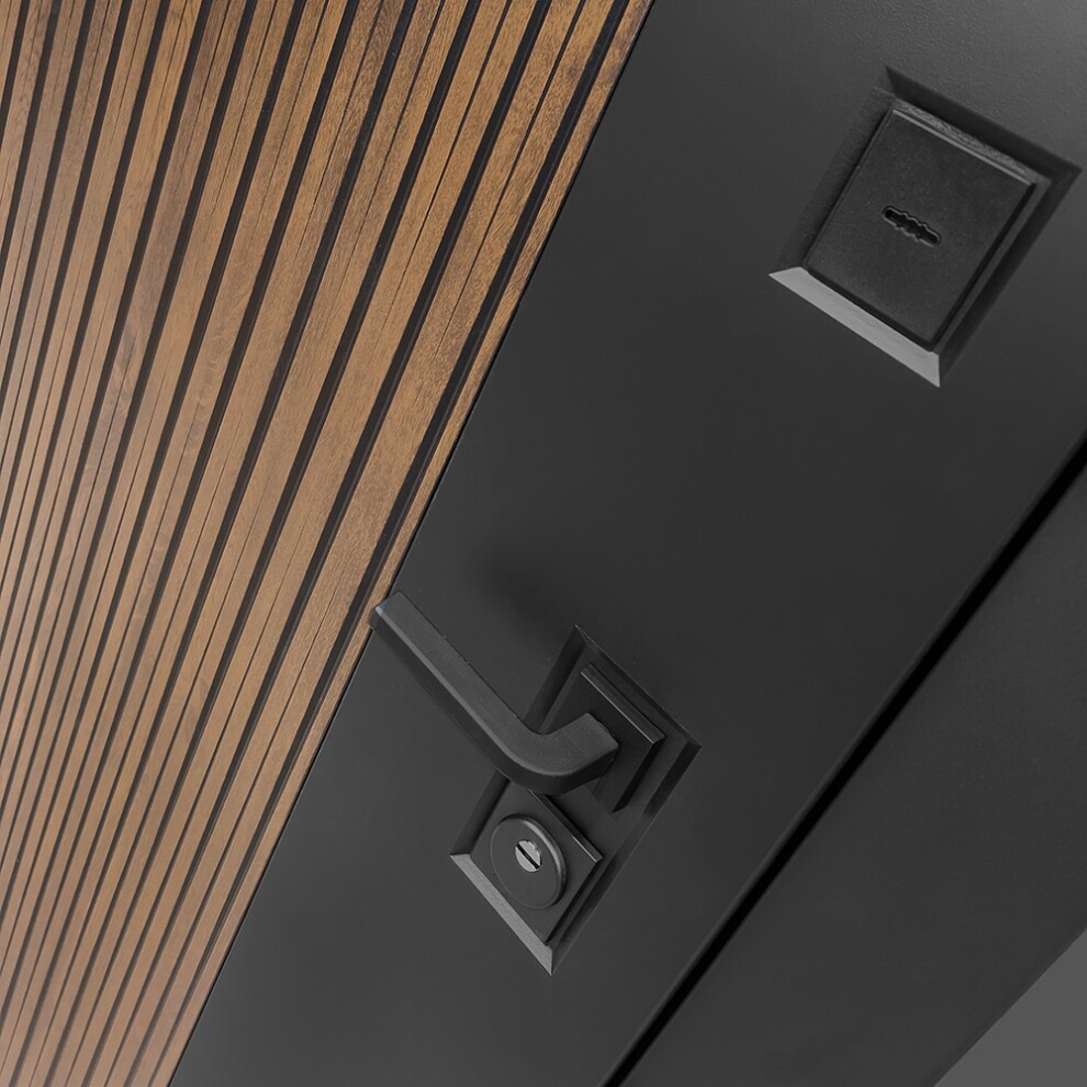 - Черная фурнитура (полимерная): накладки сувальдные со шторкой, накладка под цилиндр, дверная ручка, ночная задвижка, металлический эксцентрик с защитной вставкой.