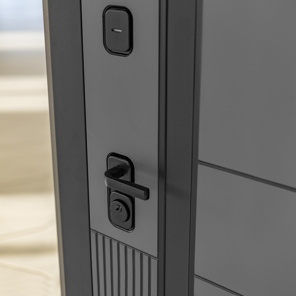 - Фурнитура в черном цвете: Броненакладка врезная, накладка со шторкой, глазок , дверная ручка, ночная задвижка. Цилиндр ключ-вертушка (производитель не регламентируется), регулируемый эксцентрик.