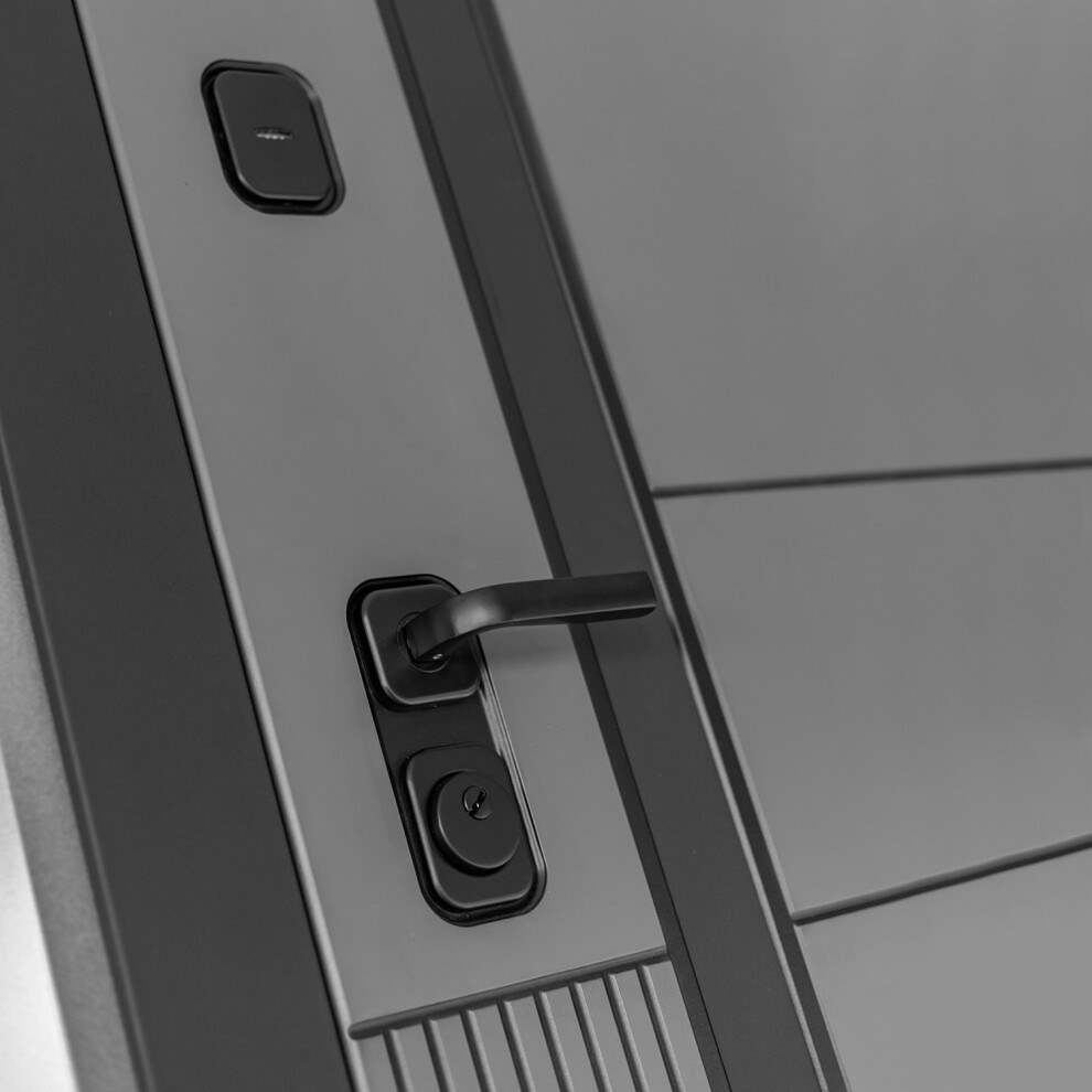 - Фурнитура в черном цвете: Броненакладка врезная, накладка со шторкой, глазок , дверная ручка, ночная задвижка. Цилиндр ключ-вертушка (производитель не регламентируется), регулируемый эксцентрик.