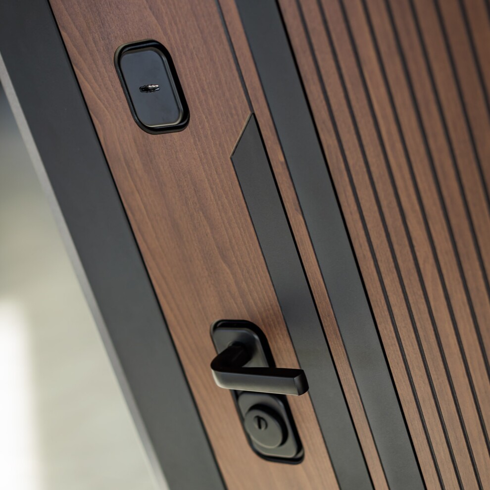 - Фурнитура в черном цвете: Броненакладка врезная, накладка со шторкой, глазок , дверная ручка, ночная задвижка. Цилиндр ключ-вертушка (производитель не регламентируется), регулируемый эксцентрик.