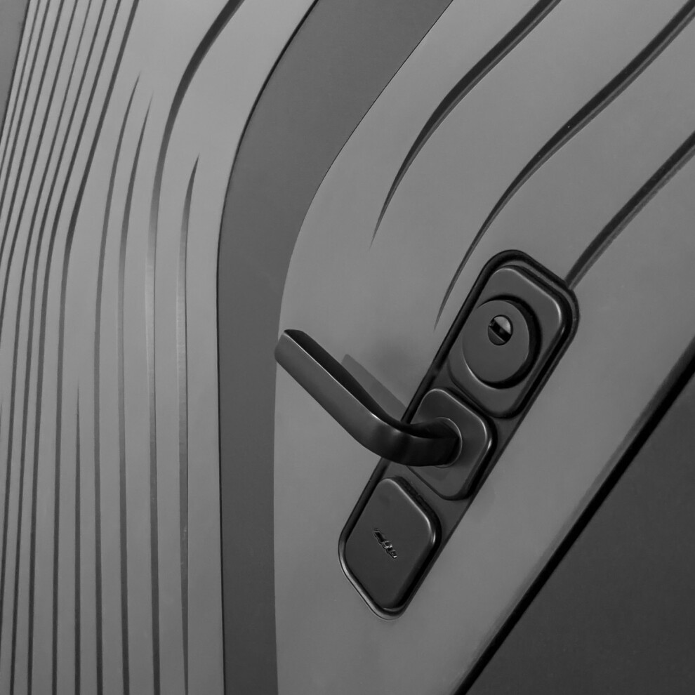 - Фурнитура в черном цвете: Броненакладка врезная, накладка со шторкой, глазок , дверная ручка, ночная задвижка. Цилиндр ключ-вертушка (производитель не регламентируется), регулируемый эксцентрик.