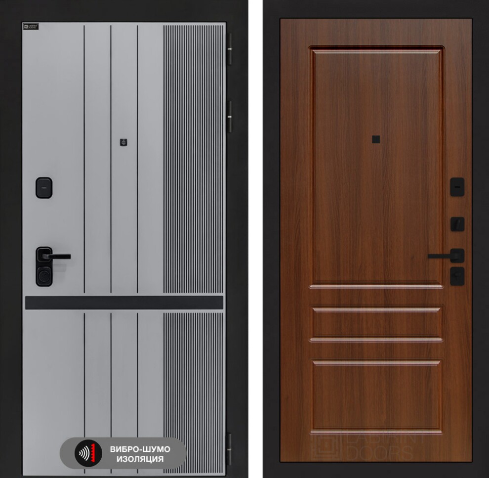 - Фрезерованная МДФ панель 10 мм, цвет "Velluto Grigio" с патиной и вставкой из металла в цвет наличника, Фрезерованная МДФ панель 10 мм, цвет "Орех американский" с патиной и вставками из металла в цвет наличника