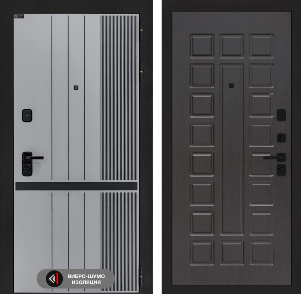 - Фрезерованная МДФ панель 10 мм, цвет "Velluto Grigio" с патиной и вставкой из металла в цвет наличника, Фрезерованная МДФ панель 10 мм, цвет "Орех американский" с патиной и вставками из металла в цвет наличника